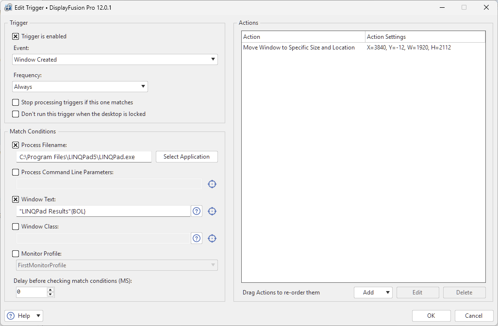 Thanks again for the DisplayFusion tip - I took the plunge on Cyber Monday. I now have this trigger working nicely with LINQPad 5 as follows: