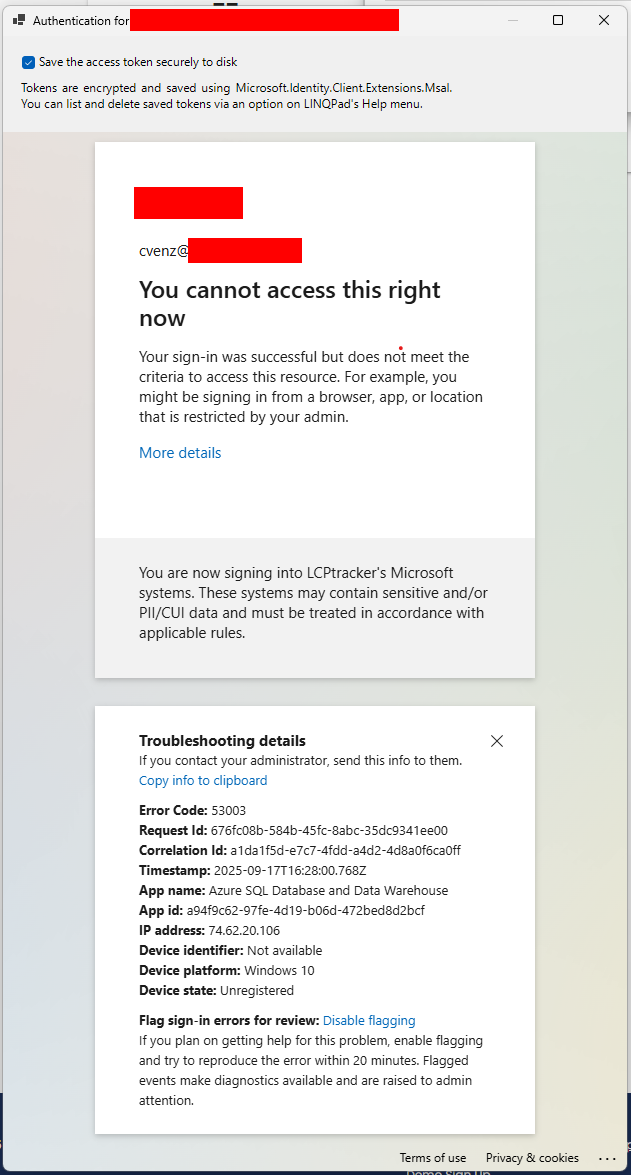 From reading google, 53003 is "AADSTS53003: Access has been blocked by Conditional Access policies. The access policy does not allow token issuance." which indicates it's some kind of Entra error with how our policies are set up, but without further info I can't really tell, and I don't have access to the Entra part of our Azure Portal to go look at the logs, so I will need to ask IT what the deal is.