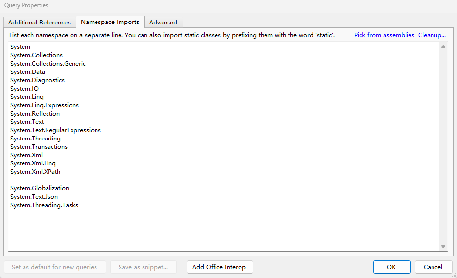 linqpad 9 doesn't support 'Pick from assemblies' in 'Namespace imports'?