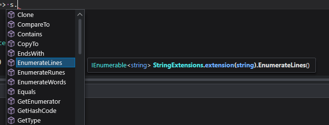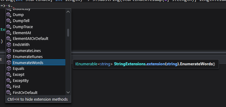 Minor problem though, when looking at the intellisense options, hiding the extension methods (Ctrl+H) doesn't hide extensions using the new syntax. It's recognized as if it were a regular member method.