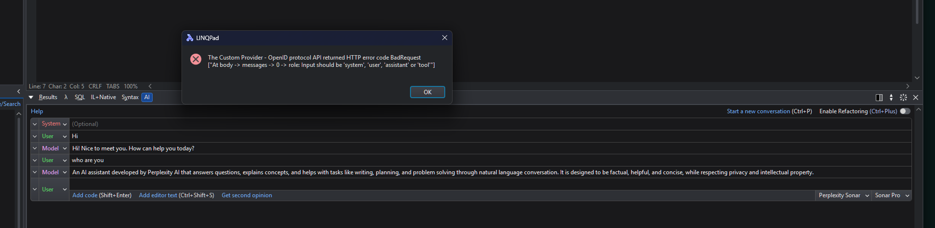 I can't use my Perplexity API in linqpad, how can I fix it?