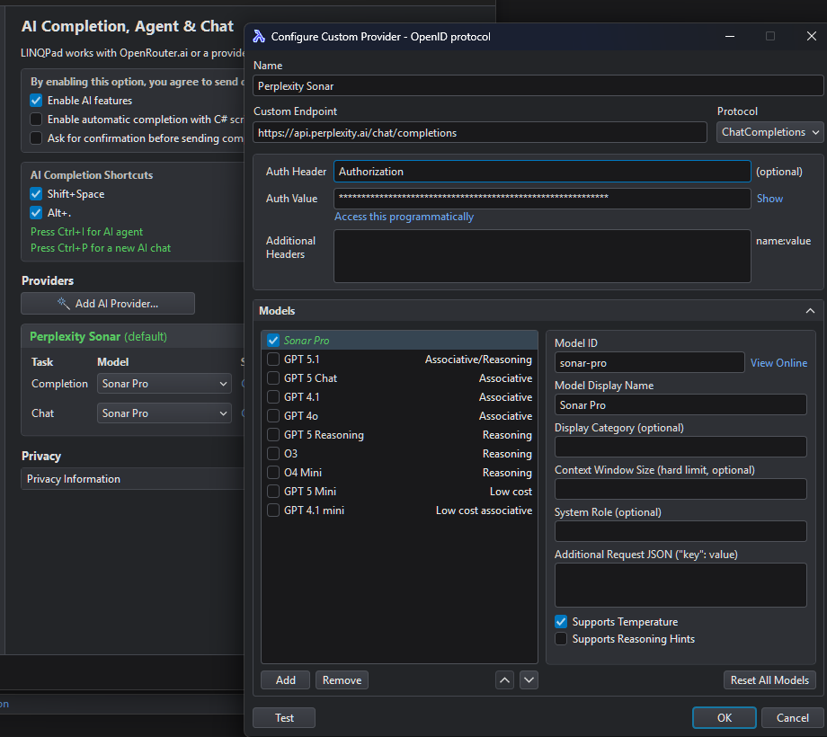 The AI configuration UI in LINQpad is so limited and is not flexible, is there any other way to configure the AI integration?