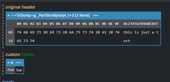 I'd like to alter the title of this table as well as the options in the extended menu. I was hoping the source object (a record with a byte array) would be used for the title but instead it used the name of a local function used within the ToDump() method. Also would have wanted to count to use the byte array length, rather than the amount of rows I dumped.