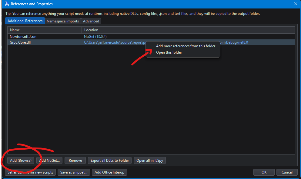 Would it be possible to allow this for regular non-nuget assemblies you add to a script using the "Add (Browse)" button as well? Maybe add the same "add namespaces" option in this dropdown?