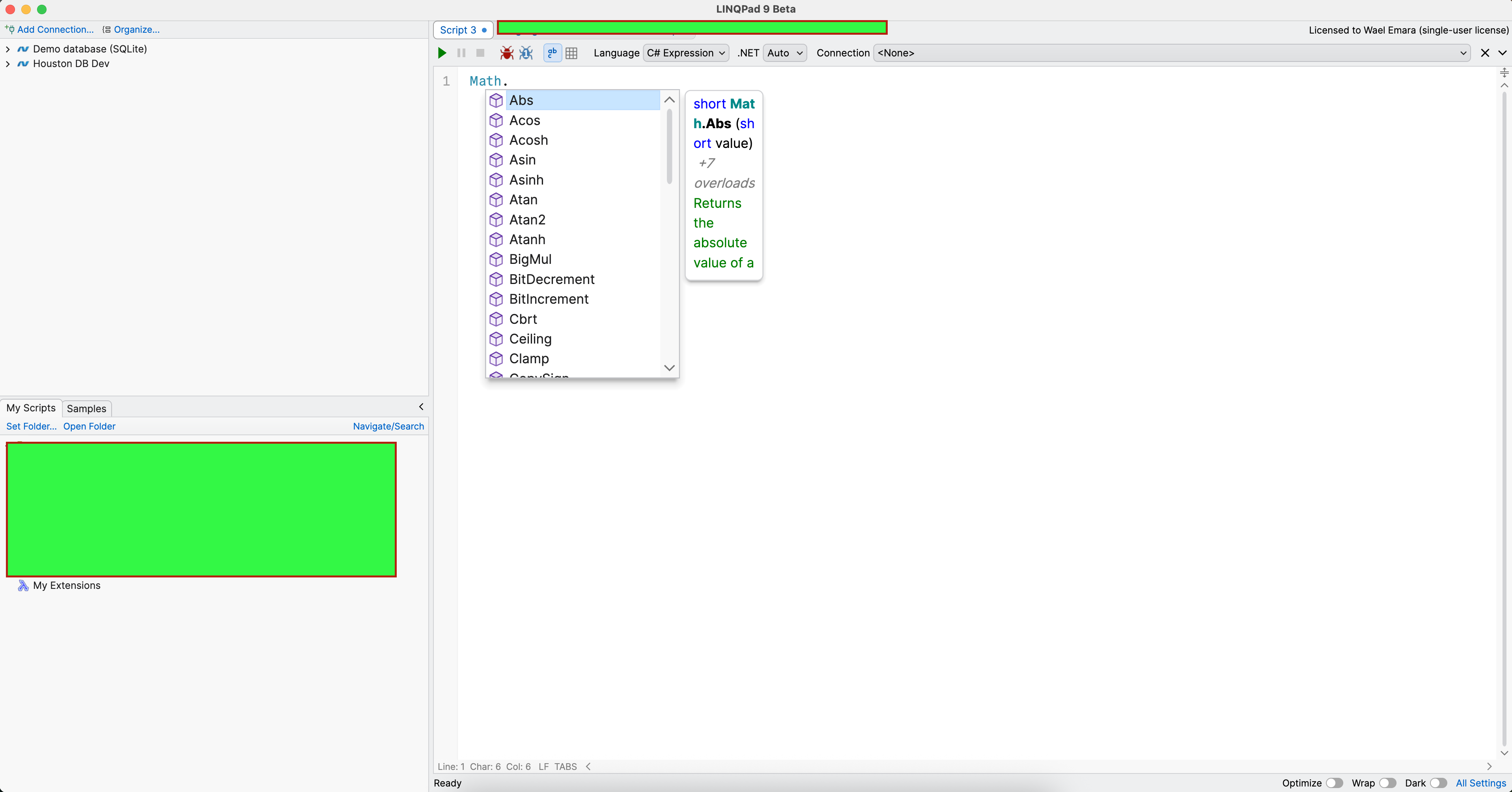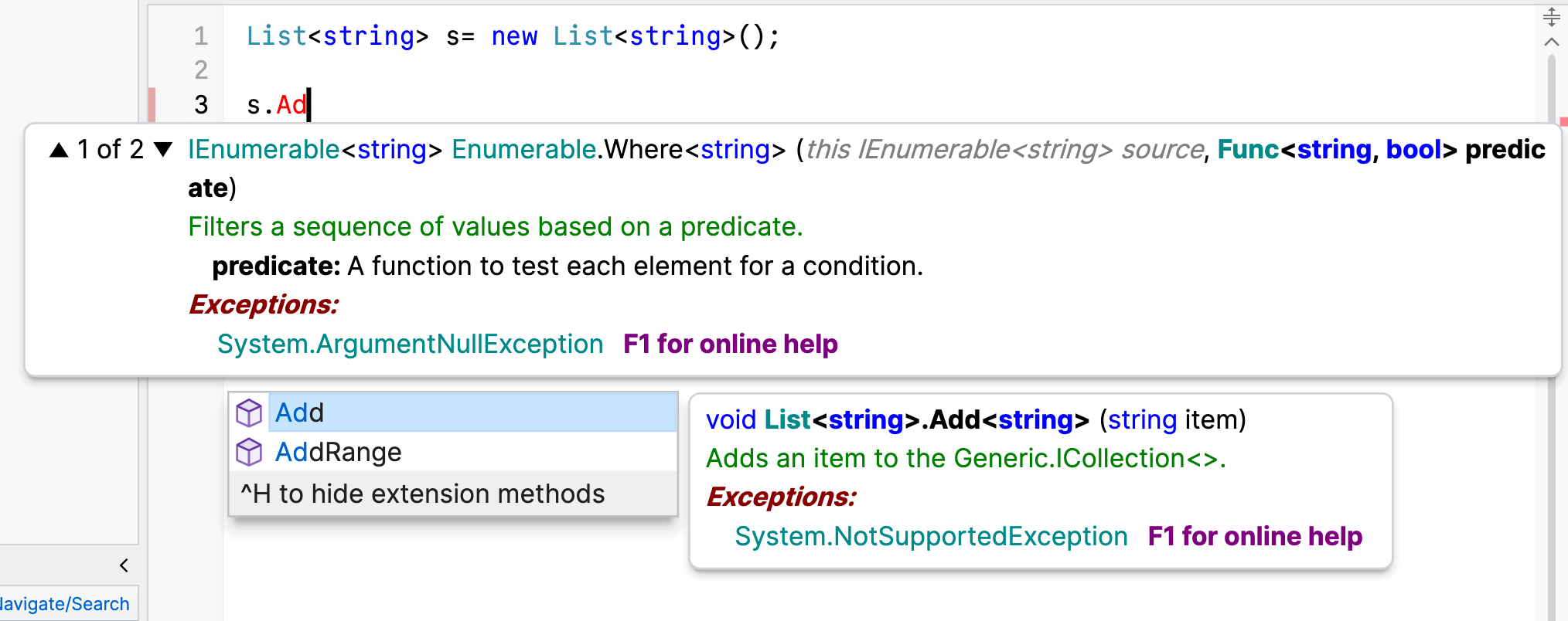 When linqpad shows IntelliSense, I see this small window, it is not big enough and does not show the information clearly, and does not show the normal info I get in VS or Rider.